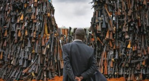 A kenyai kormányzat egyik tisztviselője ellenőrzi a begyűjtött illegális fegyvereket.
