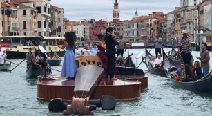 Hatalmas, úszó hegedűn adott koncertet egy vonósnégyes Velencében.