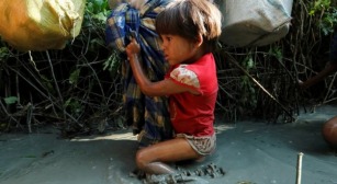 Egy gyermek a Burma– Banglades határon, családja a Naf folyón próbál átkelni.