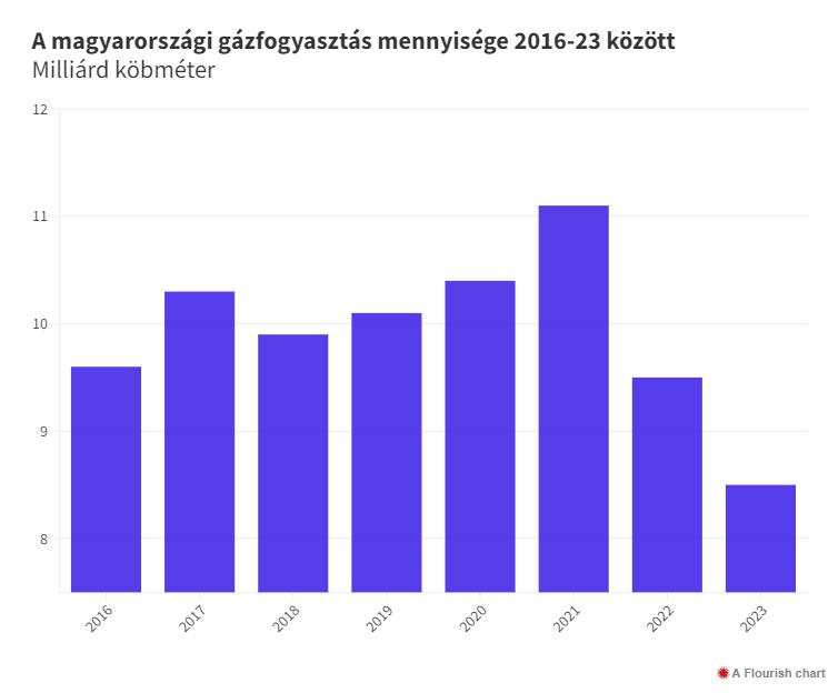 Adott tehát egy olyan szerződés, amely keretében még 12 évig a piaci ár feletti összegért kell átvennünk évi 4,5 milliárd köbméter földgázt. Eközben viszont a hazai fogyasztás, elsősorban az árak megugrása miatt, brutálisan visszaesett: miközben 2021-ben 11 milliárd köbmétert meghaladó volt az ország éves fogyasztása, ez tavaly már csak 8,5 milliárd köbméterre rúgott.
