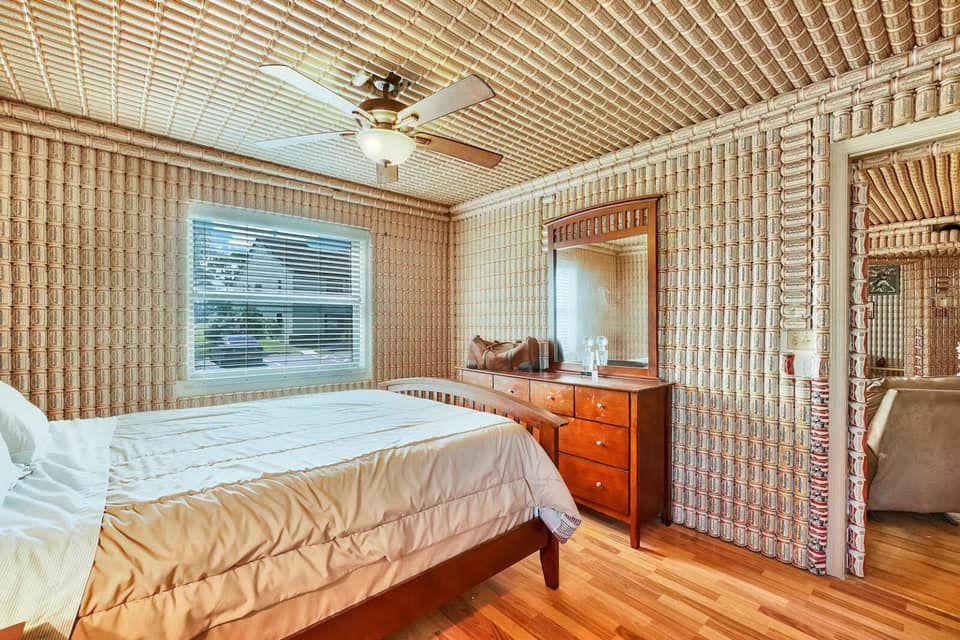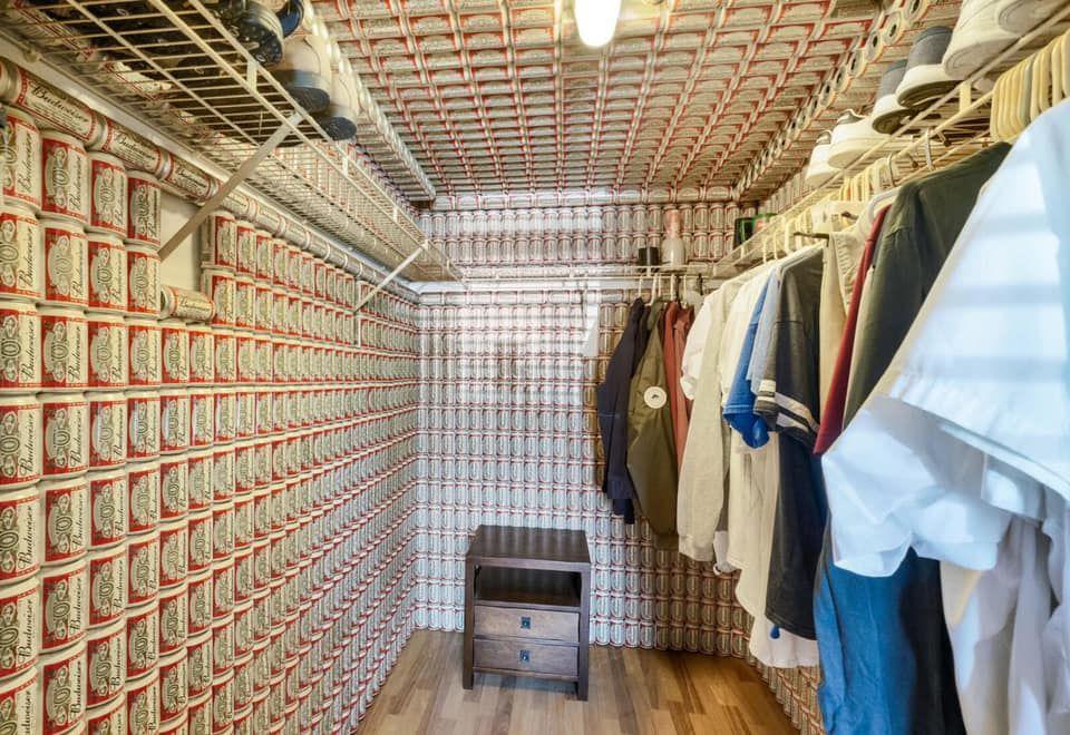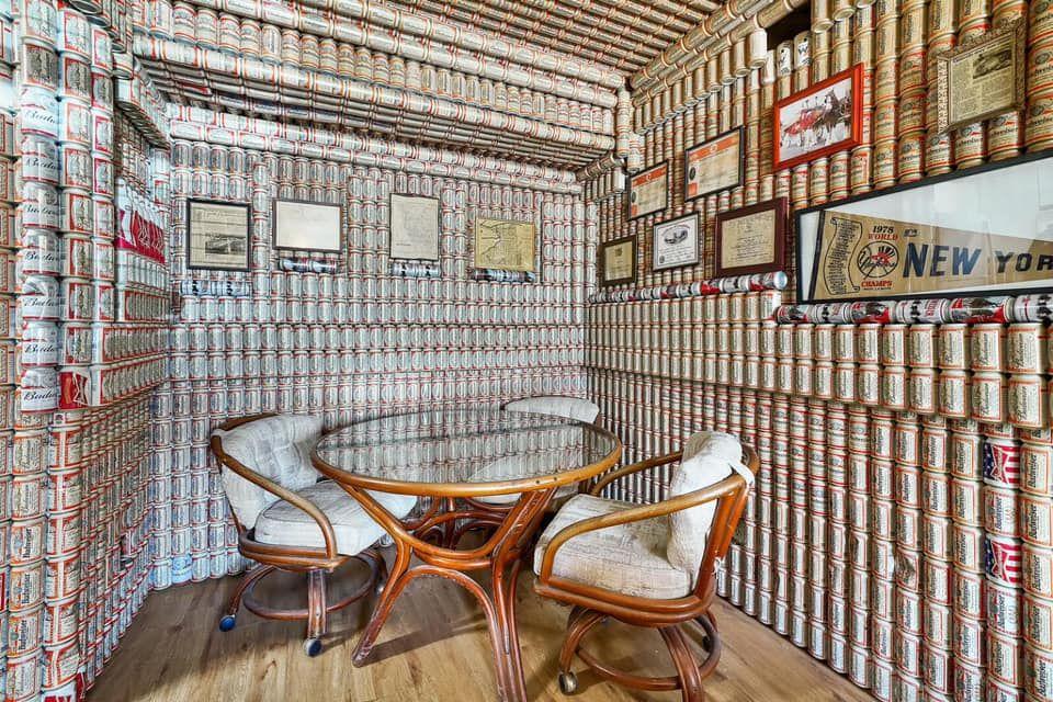A nemrégiben elhunyt férfi egész életműve látható a falakon. Azon túl, hogy rengeteg sört kellett elfogyasztania (feltehetően baráti segítséggel) élete során, hihetetlen munka és precizitás van abban, ahogy burkolatként felragasztotta az alumíniumdobozokat. Az újrahasznosítás egy meglehetősen sajátos módja ez, de összhatásában kimondottan jól mutat: