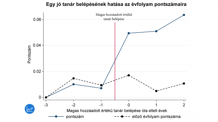 Az első ábra bemutatja, hogy a mutató tényleg megméri a tanárok hatását a tesztpontszámokra. A kék, összefüggő vonal olyan osztályok átlagos pontszámát mutatja, amelyek egy időpontban új tanárt kapnak (minden osztálynál ez a „nulladik év”), és ez a tanár a mutató alapján a felső öt százalékba tartozik. Látható, hogy a tanárváltás után az átlagos pontszám rögtön és tartósan megugrik. A fekete szaggatott vonal pedig egy korábbi évfolyam átlagos pontszámait mutatja, ahol nem jött új tanár. A szaggatott vonal nem változik, megerősítve, hogy a megugrás valóban a tanár hatása, és nem véletlen ingadozásnak vagy az iskolában történt egyéb tényezőknek köszönhető.