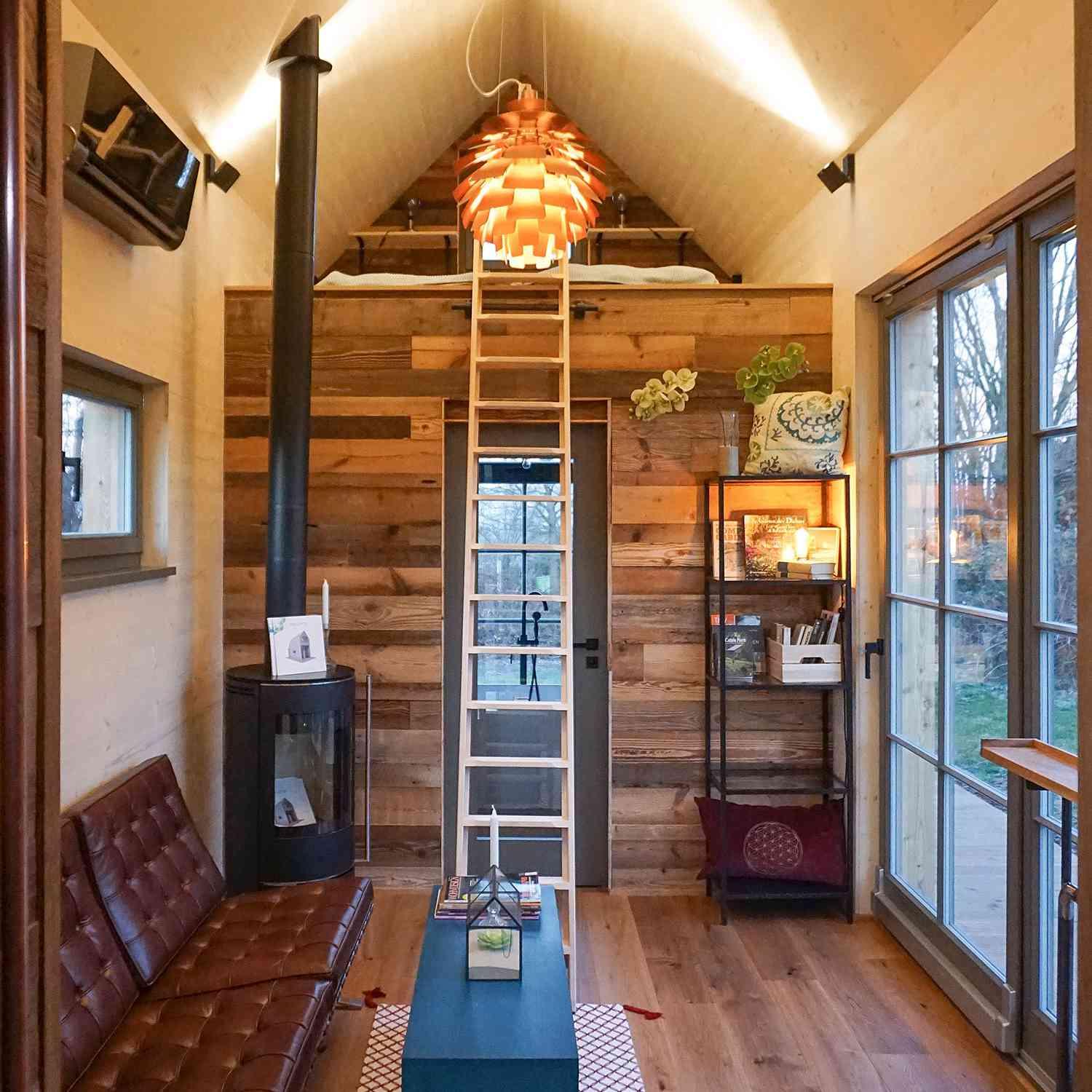 A Tiny Loft One névre hallgató csodaotthon kívülről modern designt kapott, köszönhetően a fém burkolatnak és a merész formájának. Ugyanakkor az ipari külsőt kiválóan tudták egyensúlyozni hagyományos alapanyagokkal. A nappali egyaránt illethető a modern és az otthonos jelzőkkel. Tágasnak érződik a nagy belmagasságnak valamint a hatalmas teraszajtóknak köszönhetően.