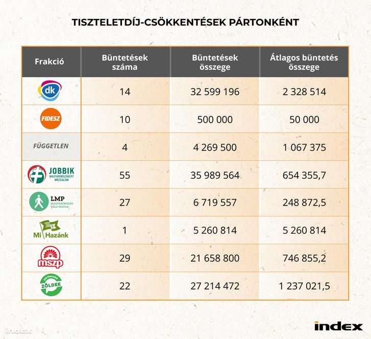 Érdekesség, hogy a 10 legtöbb büntetést kapó politikus összesített bírsága 74 996 982 forint, ami meghaladja a további 104 tiszteletdíj-csökkentésben részesülő képviselő összesített bírságát, az ugyanis csak 59 399 331 forint.