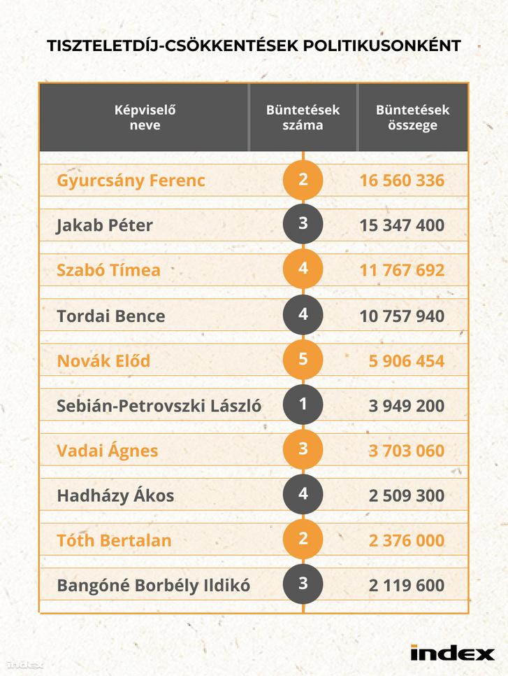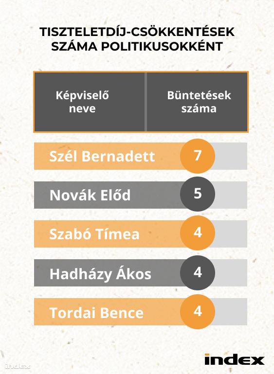 Azonban egyikőjük sem ér fel Szél Bernadett szintjére, akit hosszú pályafutása alatt már hétszer sújtottak tiszteletdíj-csökkentéssel. Őt követi Novák Előd 5 bírsággal, majd a dobogó harmadik fokán hármas holtversenyben áll Szabó Tímea, Hadházy Ákos és Tordai Bence.