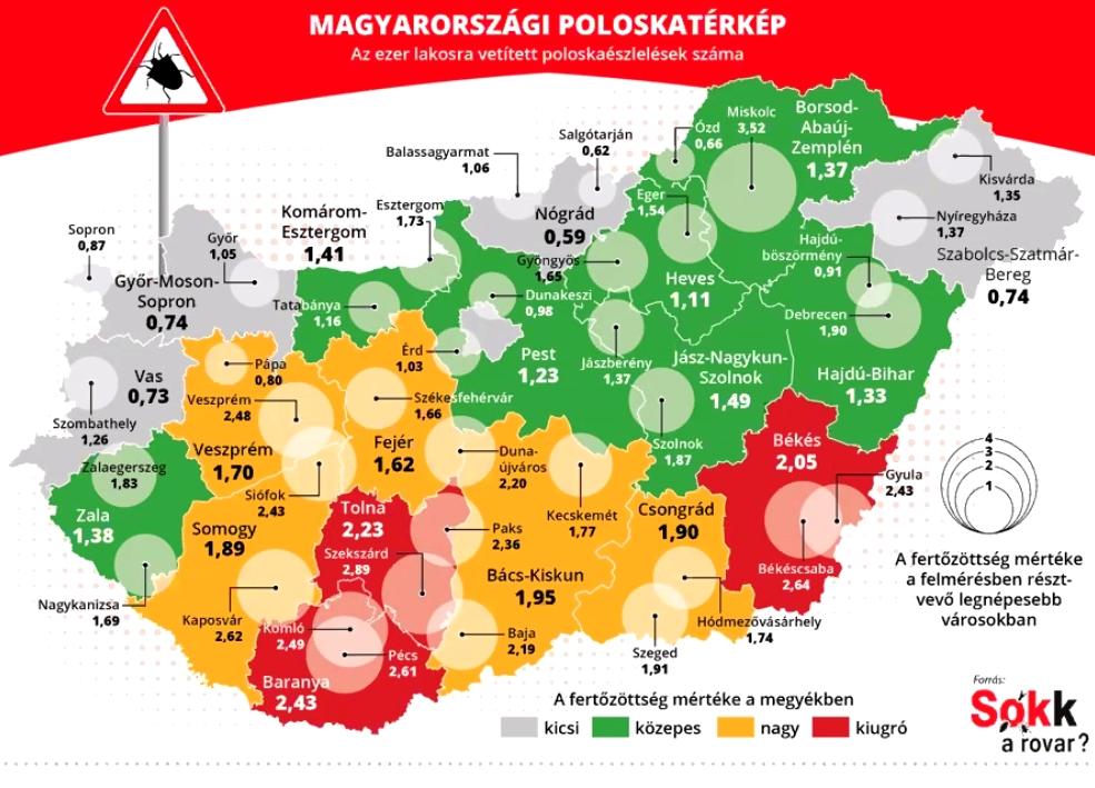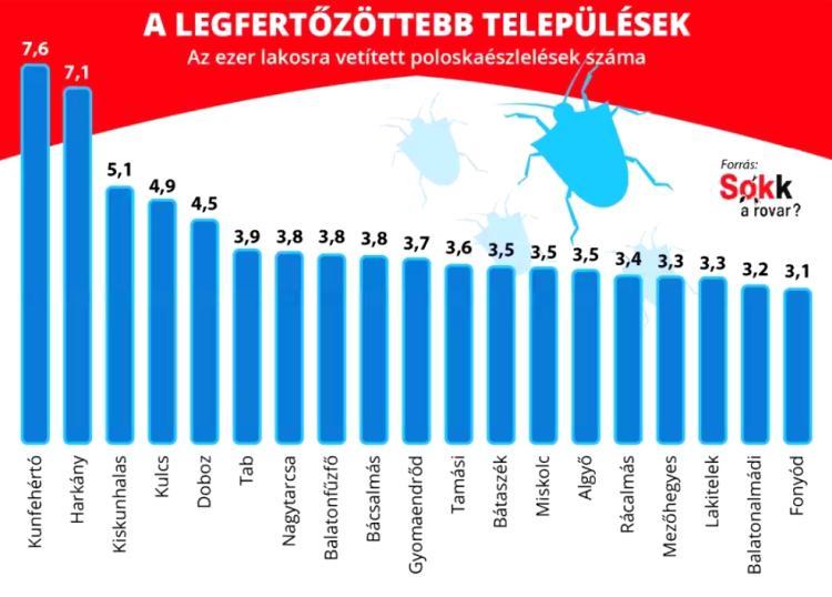 A legfertőzöttebb megyék Baranya és Tolna, de dobogós helyen végzett Békés megye is. A települések közül Kunfehértón (7,6) mutatták ki legnagyobb egyedszámban a címeres poloskákat (1000 fő lakosra vetítve), de magas volt még Harkányban (7,1) is az egyedszám. A harmadik helyre, egy kisebb visszaeséssel Kiskunhalas (5,1) került.