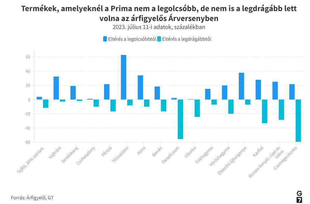 Az adott napon a Prima így összességében 51 termékből 30 esetében nem jött volna ki jól abból, ha a vásárlók az Árfigyelőben szúrós szemmel nézik az adatokat, és csak négy olyan termék volt, amellyen megnyerte volna az aktuális árversenyt.