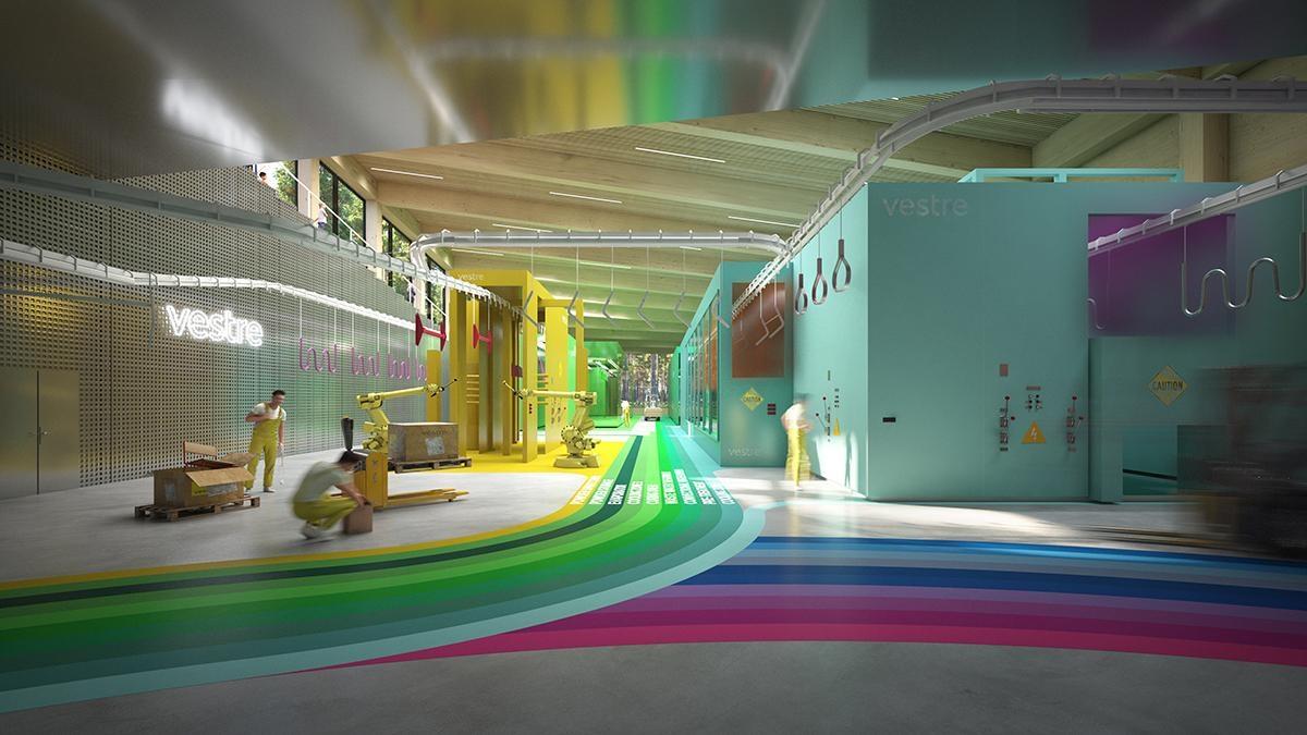 A Plus számos 4.0-s ipari megoldást alkalmaz, például intelligens robotokat, önjáró teherautókat és az egész gyárat irányító tabletet. Minden gépet a Vestre 200 színének egyike jelöl, az útvonalaik pedig térképként jelölik a munkafolyamatokat, így még egy egyszerű látogató is könnyen végigkövetheti a gyártást, akárha egy múzeumot járna végig. Minden épületszárnynak van egy megemelt mennyezeti sarka, így lejtős tetők képződnek. Belülről ezek afféle kilátópontok: befelé a gyártócsarnokokba, kifelé az erdőre. A színező üzem és a fagyár hossztengelye mentén meghosszabbítják a lejtős tetőket, utat képezve ezzel a dolgozóknak és a látogatóknak. A négy gyártóegységet 21 méteres, szabad fesztávú, keresztrétegelt faanyaggal építik fel, oszlopok nélküli üres tereket képezve. A műszaki infrastruktúra egy három méter széles szervizfolyosón mozoghat.
