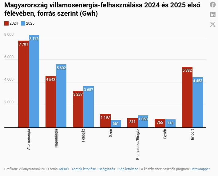 A villamosenergia-felhasználásunk 683 GWh-val, azaz közel 3%-kal növekedett az előző év azonos időszakához képest (23.637 GWh-ról 24.320 GWh-ra). A bővülő fogyasztás azonban nem járt az import növekedésével, ugyanis a saját termelésünk még nagyobb mértékben, 1612 GWh-val emelkedett. Az áramimportunk így 5382 GWh-ról 4453 GWh-ra, az aránya pedig 22,8%-ról 18,3%-ra csökkent.