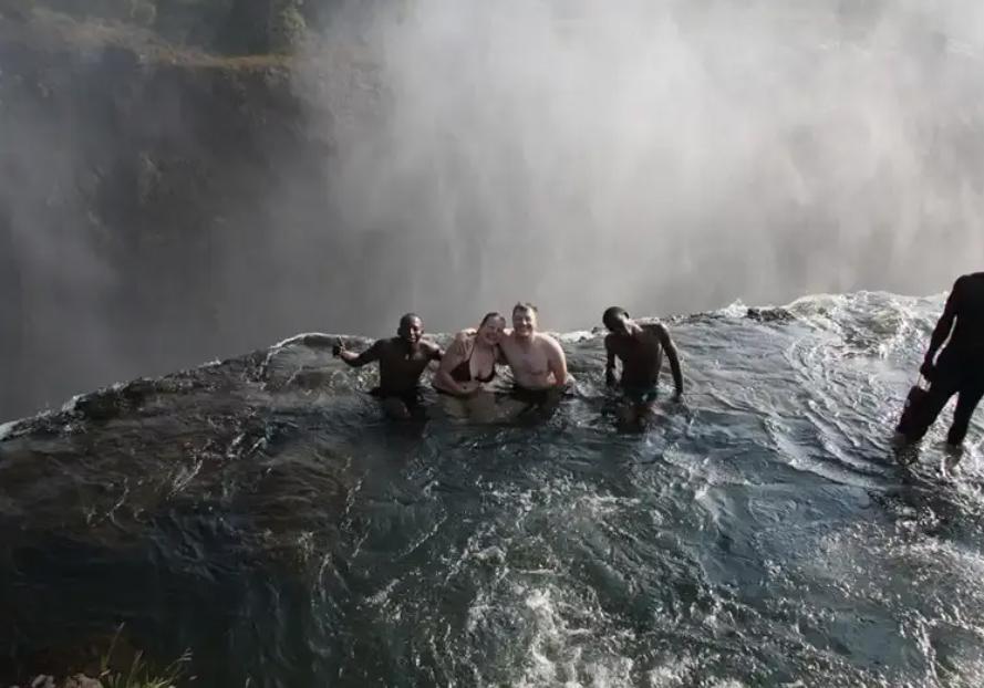Valóban lélegzetelállító látvány és fantasztikus élmény lehet megmártózni a Zambia és Zimbabwe határán található, száz méteres mélységbe alázúduló vízben.