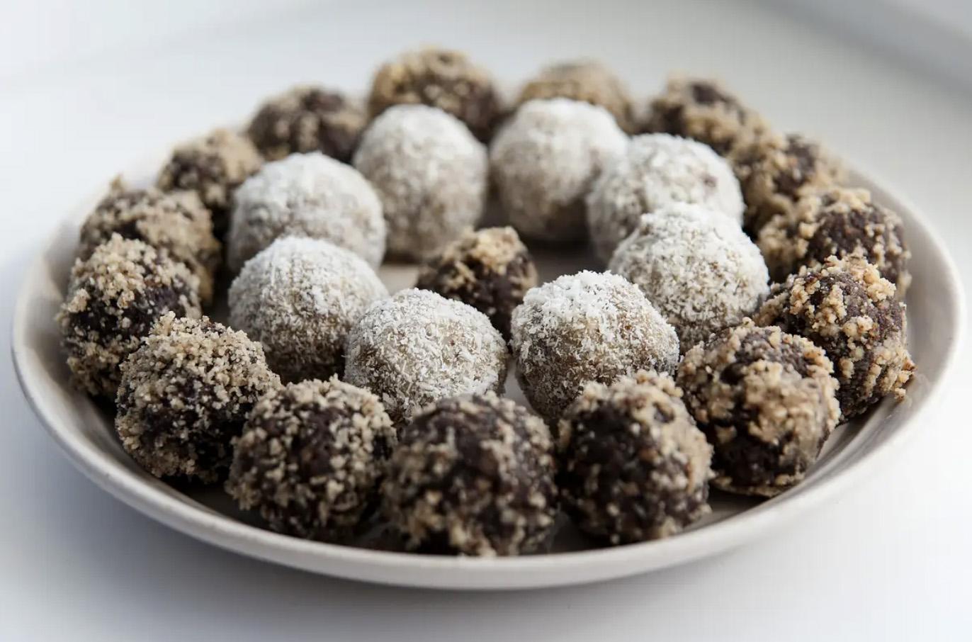 Kis nedves kézzel formázz diónyi golyókat (kb. 18-20 g darabonként). Forgasd meg őket kókuszreszelékben, aprított dióban vagy kakaóporban – ahogy szereted.