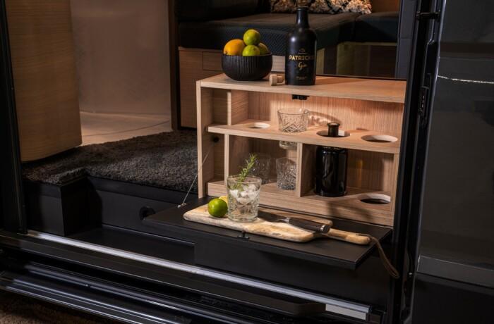 A tervezők szinte mindenre gondoltak: ha valaki szellőztetni szeretne, akkor nyitva hagyhatja az oldalajtót, de közben kihúzhatja a szúnyoghálót, hogy ne teljen meg a furgon éhes vérszívókkal egy vízparti kempingezés közben. A hátsó ajtóknál pedig egy grillnek is helyet adó munkaasztal húzható ki a hangulatos estékhez. Sőt, az oldalsó tolóajtóhoz egy helyes kis tálaló szekrényi is rendelhető.