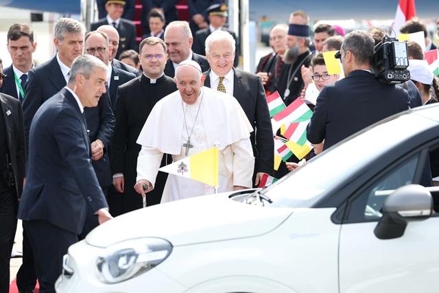 A katolikus egyházfő a Liszt Ferenc Nemzetközi Repülőtéren egy Fiat 500X-ba ült be.