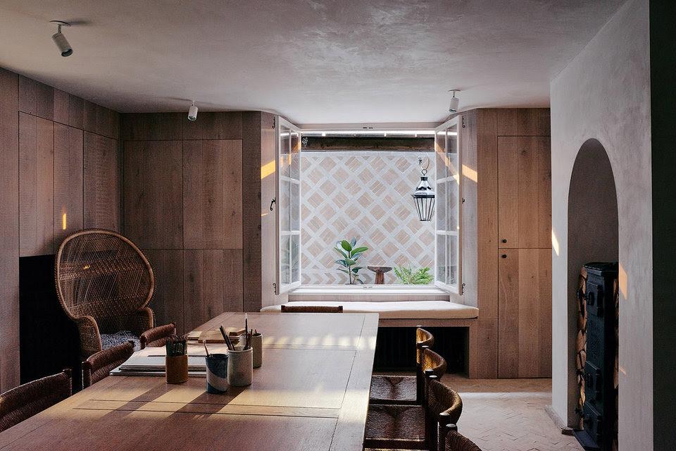 A belső tér kialakításában nagy szerepe volt a mészvakolatnak és a tölgyfadeszkáknak, a rusztikus enteriőrnek ugyanakkor kiváló ellenpontja a Veined Arabescato márványfelület és a smaragd árnyalat – az antik és vintage bútorok pedig barátságos hátteret biztosítanak az egész történethez. A renoválási munkát a Chan + Eayrs munkatársai végezték.