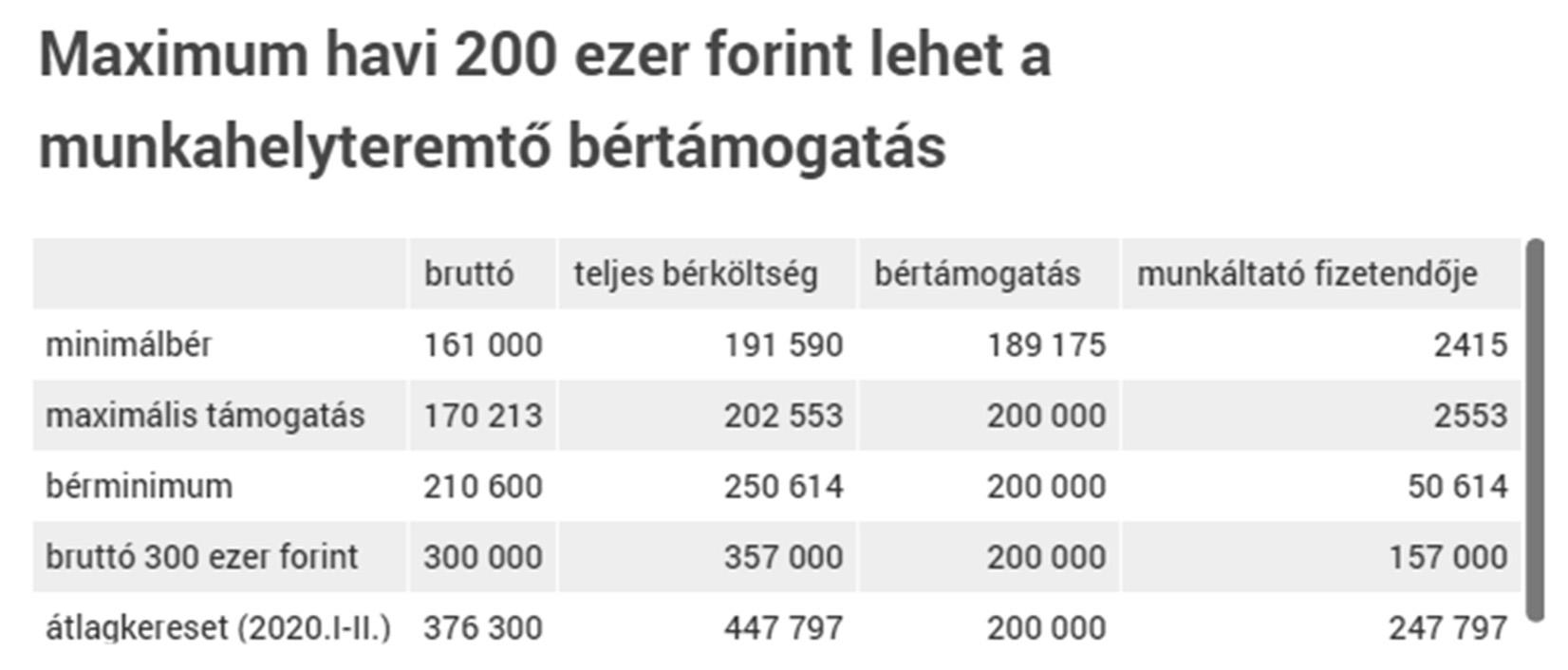 Ez az összeg bruttó 162 107 forintos fizetésnél jön ki, ami alig több, mint a 161 ezer forintos minimálbér. Ez az átlag úgy lehetséges, ha a kormány arra számít, hogy a támogatott munkavállalók zöme, tízből mintegy 8 újonnan felvett dolgozó minimálbéres lesz.
