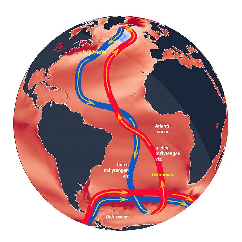 Ismert, hogy az Atlanti-óceán meridionális áramlási cirkulációja (AMOC) a Föld óceáni szállítószalagjának részeként meleg, felszíni vizeket szállít északra és hideg, mélységi vizeket délre az európai és az amerikai partok között.