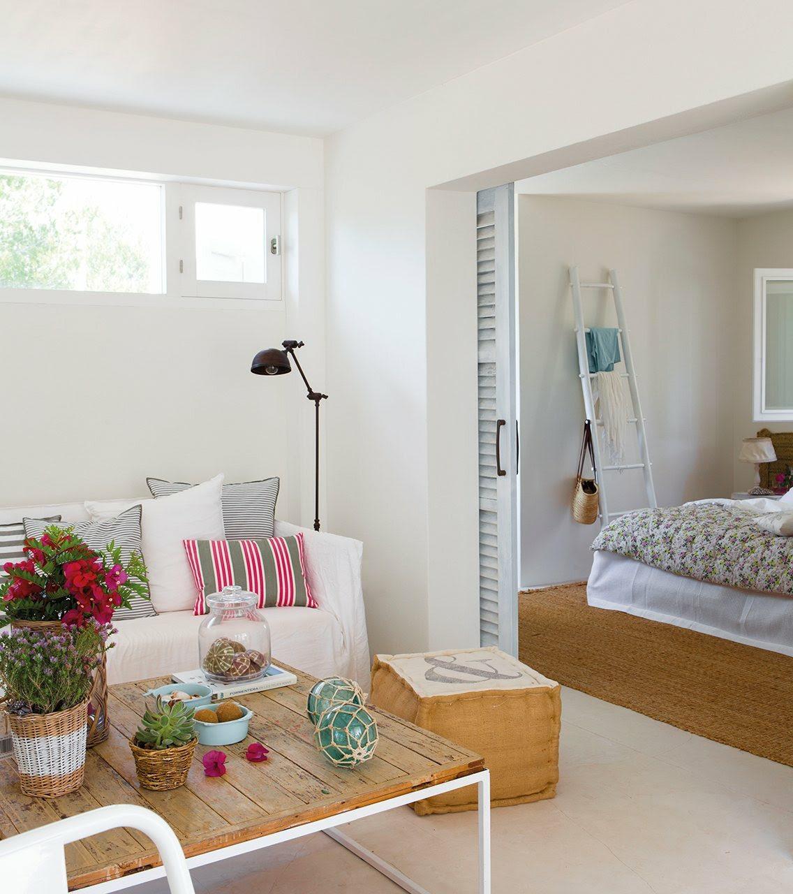 Újrahasznosított tárgyakat is találunk a térben. A bútorok egy része használt bútor a tudatosság jegyében. Az eredeti elemek is látványosak, mint például a zsákvászonból készült puff, amelyek egyéniséget adnak a nappalinak, és ideálisak olyan kicsi helyekre, mint ez. A tolóajtóknak köszönhetően, - amelyek valójában újrahasznosított redőnyök, - kékesfehérre csíkozva választják el a nappalit a hálószobától.