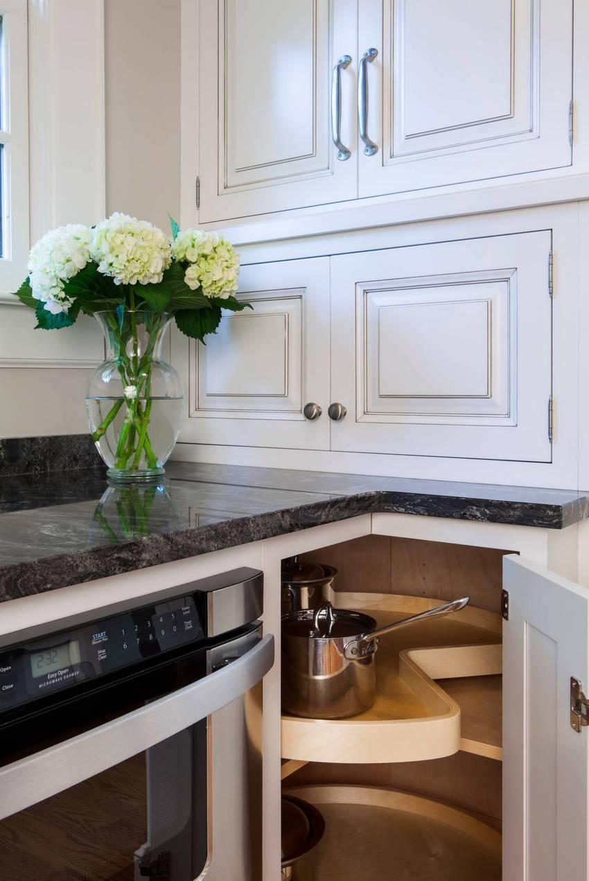 Az L-alakú kamra sarokpolcai szintén gondot okozhatnak a szervezettségben. Mindent elnyelhet ez a tér, ha nem gondoskodunk rendszerezésről. A legegyszerűbb, ha úgy tekintünk rá, mint egy megoldásra váró feladatra. Használjunk különböző tetejű dobozokat, üvegeket, rendszerezőket, és címkézzük fel őket.