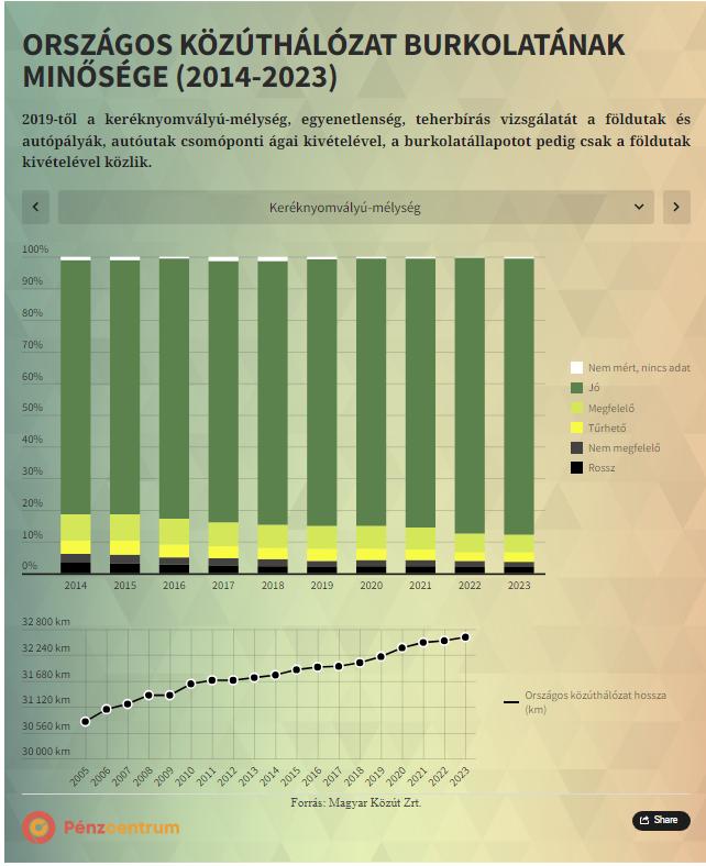 Az utak minőségével kapcsolatban pedig a Magyar Közút Nonprofit Zrt. adatai lehetnek beszédesek. A Magyar Közút 2013-tól évente felméri a burkolat állapotát, az egyenetlenséget, a nyomvályúsodást és a teherbírást, ezek szerint a szempontok szerint osztályoznak: az utak minősége lehet jó, megfelelő, tűrhető, nem megfelelő és rossz, illetve vannak olyan utak, amelyekről nem áll rendelkezésre adat. A Pénzcentrum most a teljes kiépített hálózatból azokat az utakat vizsgálta, melyek a Magyar Közút Nonprofit Zrt. kezelésében állnak.